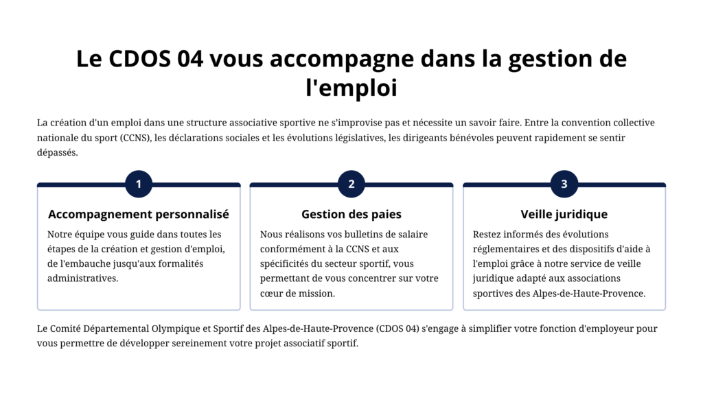 1. Signer une convention d’assistance avec le CDOS. 2. Transmettre les différents documents liés à l’emploi. 3. Fournir les éléments nécessaires pour la réalisation des bulletins de salaire.
